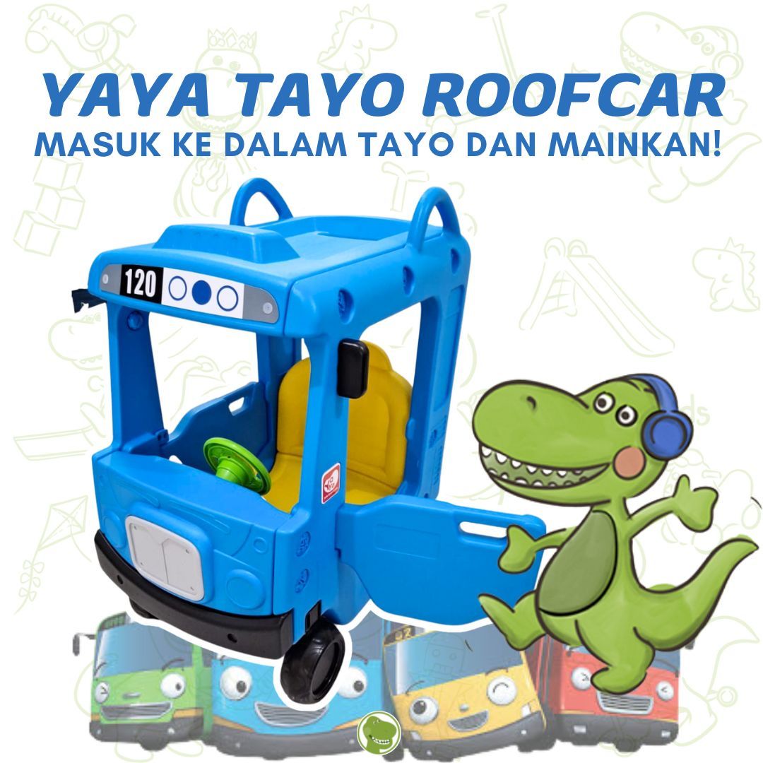 Mainan mobil-mobilan motif Tayo yang dikayuh menggunakan kaki. Ada alas kaki untuk anak yang lebih kecil jadi tidak menggantung, dan ada pegangan untuk mendorong.