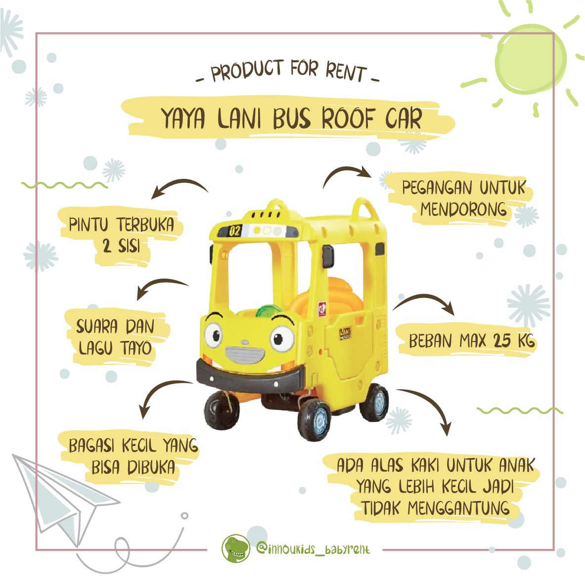 Mainan mobil-mobilan motif Lani sahabat Tayo yang dikayuh menggunakan kaki. Ada alas kaki untuk anak yang lebih kecil jadi tidak menggantung, dan ada pegangan untuk mendorong.