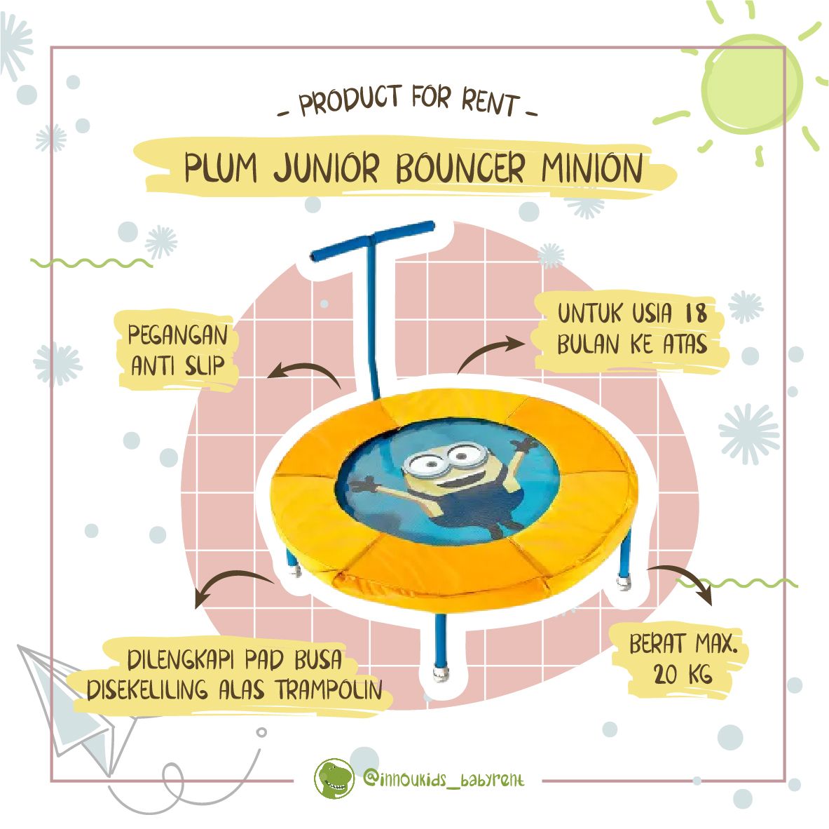 Hadirkan permainan yang menarik dengan trampolin junior dari Plum. Permainan ini memungkinkan anak Anda untuk melatih ketrampilan motorik dan rasa percaya diri sejak dini. Konstruksi trampolin terbuat dari steel, dengan tambahan finishing powder coating untuk meningkatkan daya tahan terhadap korosi dan karat. Trampolin memiliki pad busa disekeliling alas, dan dilengkapi dengan pegangan anti slip sebagai alat bantu agar anak tidak mudah terjatuh. Cocok untuk anak berusia 18 bulan ke atas.