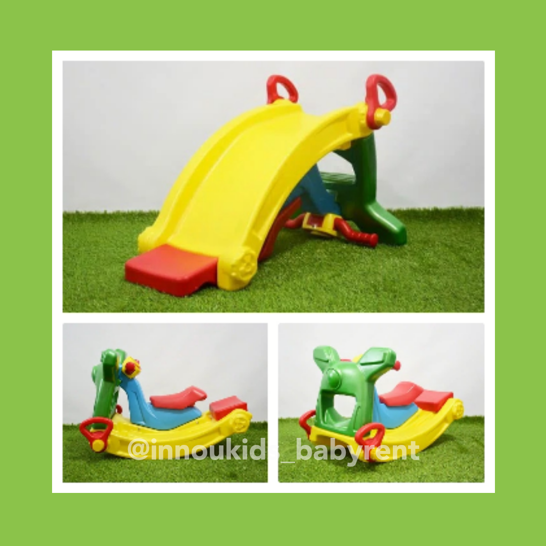 Perosotan yang bisa dibalik menjadi kuda-kudaan. Ada tombol suara motor dan lagu. Mulai usia 1 tahun sampai max 25 kg.